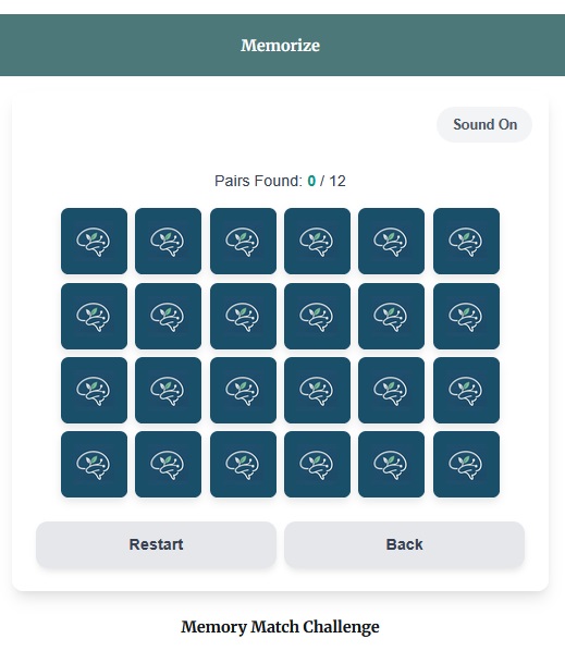 Sharpen your visual memory! Find the matching pairs hidden behind the cards in this relaxing brain exercise. How fast can you clear the board?