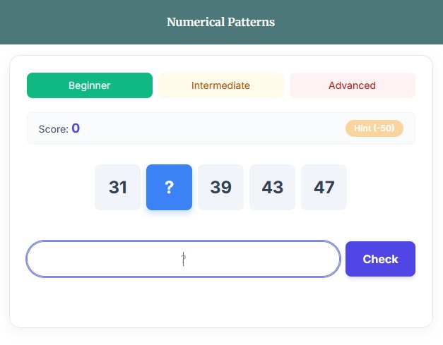 Master your mental math with Number Pattern Challenge! Analyze sequences, discover the hidden logic, and find the missing numbers across three difficulty levels. Sharp your logic and beat your high score!”